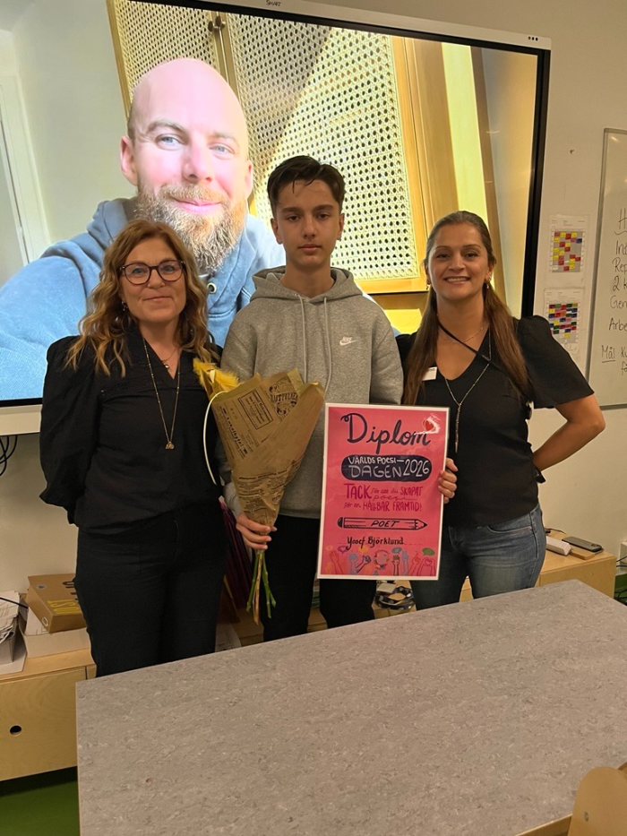 Under fredagen genomfördes det gemensamma firandet av vinnarna i Sustainable Poetrys poesitävling. Hela skolan uppmärksammade elevernas fina insatser, och alla elever bjöds på glass. Vinnarna fick ta emot diplom och blommor av rektorerna.