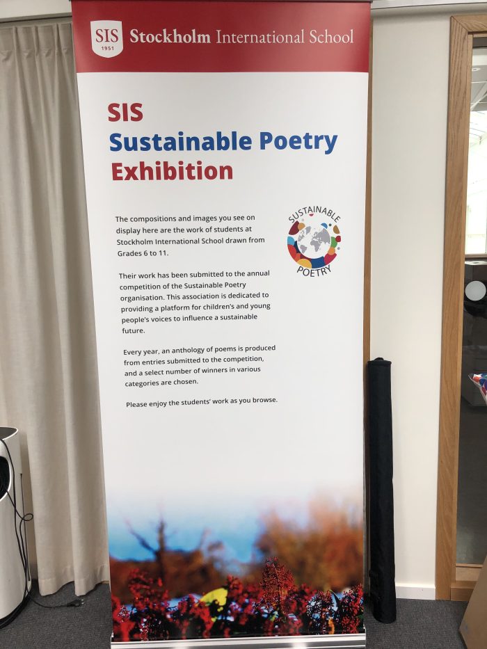 På Stockholm International School uppmärksammades Världspoesidagen med ett poesievent där elever, lärare, föräldrar och andra medlemmar i skolgemenskapen välkomnades att delta. Bland annat open mic, utdelning av diplom till elever som deltar i Sustainable Poetrys poesitävling, sjungande poeter, elever som läste sina egna dikter på olika språk, musikframträdanden med mera.