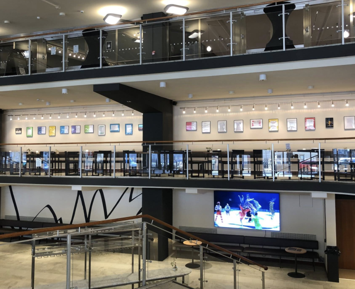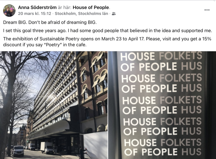 Därtill blev det ett besök i Folkets hus. Där samlades elever, skolpersonal och allmänheten för att ta del av en utställning som innehåller elevernas dikter som exempelvis är baserade på årets tema i Sustainable Poetry: Kärlek för en hållbar framtid. Klasser från hela skolan, som skapar verk kring poesi när de firar Världspoesidagen, uppmuntrades också lägga till sina verk och visa upp sina dikter i Folkets hus.